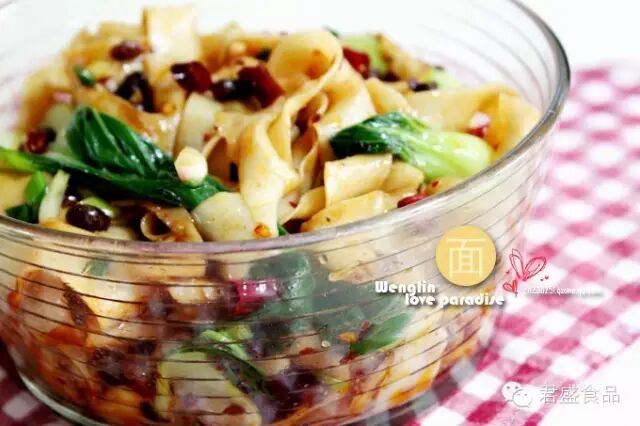 油泼面是一种很普通的面食制作方法,将君盛玉带宽面条在开水中煮熟后捞在碗里,将葱花碎、花椒粉、盐等配料和厚厚一层的辣椒面一起平铺在面上,用烧的滚烫的菜油浇在调料上,顿时热油沸腾,将花椒面、辣椒面烫熟而满碗红光,随后调入适量酱油、香醋即可。也可另外加入腊汁肉、西红柿鸡蛋等搭配食用。