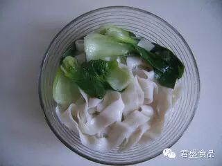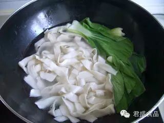 锅中的水烧开,放入君盛玉带宽面和青菜煮滚,捞出放入碗中;面条的软硬程度根据你的口感喜好!其次,碗要大点大点再大点,方便拌面