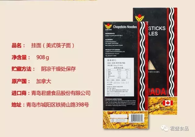 采用加拿大罗杰斯5级面粉中的顶级面粉制作生产的加拿大黄金小麦挂面(Canada Gold Wheat Noodles)、美式筷子面(American Chopsitcks Noodles) ,已通过加拿大海关、中国海关、中国商检的层层严格检查,现已进入中国市场。